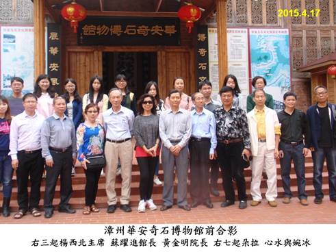 圖片說明: 1 漳州華安奇石博物館前合影 右三起楊西北主席、蘇躍進館長、黃金明院長、右七起朵拉、心水與婉冰 2 婉冰攝於華安奇石生產地九龍璧 3 九龍璧魚王奇石 4 心水、婉冰、黃金明院長、朵拉、平青館長2015.4.19合影於五百羅漢奇石苑