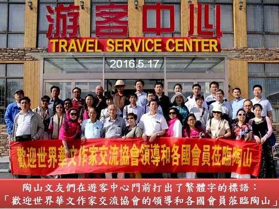 下午三時許,世界華文作家一行來到糧畫小鎮,參觀了糧畫體驗吧、農村淘寶網、遊客中心等。大家對糧畫文化非常感興趣,不時圍著講解員問糧畫的製作工藝和產品銷售,糧畫姑娘和講解員一一給予了詳細解答。在遊客中心他們和在陶山作家網得知海外作家來參觀的消息後,專門趕來的陶山文友見面、問候。陶山文友們打出了繁體字的標語:「歡迎世界華文作家交流協會的領導和各國會員蒞臨陶山」。最後,大家一起合影留念。