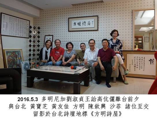各位,詩人農夫王貽高今2016-5-4日結束台灣的旅程,返回多明尼加繼續其陶淵明式的生活,王大班在台北的最後一夜獻給甫自美國加州聖荷西匆匆趕回台北的大詩人方明兄,台北文友歡喜忝為陪客,大家在方明詩屋與詩人及夫人共聚一堂,笑聲不絕並留下儷影,王貽高詩人說他此行無憾矣,見到他一直盼望著想見到的所有人,也見到了意想不到而竟然見到的人(那就是分別了幾十年意外重逢的陳欽興),我們謹盼望王詩人與夫人經常撥冗回來與台北文友歡聚,今天珍重再見,後會有期囉。