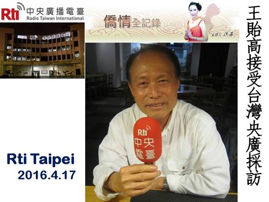 各位:台灣中央廣播電台粵語節目採訪詩人王貽高已於2016.4.25中午起開始播出,從廣播中我們聽到一位文人務農的有趣經歷,請收聽啦。http://www.rti.org.tw/player.php或http://radio.rti.org.tw/program/detail/?recordId=300