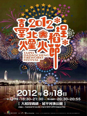 台北大稻埕煙火節今年已進入第6年,今年是歷年歷次最令人驚艷和讚嘆的一次煙火秀,在水面設計方面以23座浮筒連接成一條長達500公尺與大稻埕水岸平行的高空煙火施放平台及沙洲超高空煙火點,又有五艘拖船配合,以無線遙控施放特殊類煙火,如美如孔雀開屏般的罕見水面爆破煙火,及給情人們獻上無限愛意的新式花束煙火等。