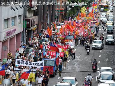大約有成千民眾在9月23日午後,自動自發的來到台北國父紀念館集合,參與台灣保釣大遊行,這次「九二三保釣大遊行」是由數個民間團體組成的「人人保釣大聯盟」所發起的,很多民眾自己製做「反日侵佔釣魚台」、「反對李登輝賣台」、「捍衛主權、寸土不讓」、「沒有主權,哪來漁權」、「兩岸聯手保衛釣魚台」等標語,新黨和親民黨在現場有分發國旗給參加遊行的民眾,在高呼「釣魚台是我們的」、「釣魚台是中華民國的」的口號聲中,遊行抵達日本在台交流協會遞交抗議書,要求日本立刻退出釣魚台,將釣魚台列島歸還台灣。日本交流協會派總務室兼經濟室主任杉田雅彥代表收下抗議書,並承諾轉達意見。