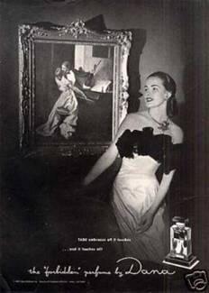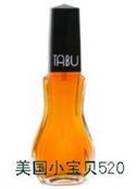 kiss kiss kiss忘情的接吻。另外的一個廣告則是穿著華服的女士身後掛著一幅樂師挪開小提琴抱著一位女士熱吻的繪畫,顯然廣告的重點就是在這幅畫,到底不知是因為廣告而有小提琴,還是為小提琴而有廣告的設計,總之在那個時代這些廣告的意涵都隱喻著「偷情的禁忌」,廣告的目的顯然是一再想挑動深閨貴婦們的幻想。不過,事實上Tabu確是有一款小提琴造型的香水,瓶子設計十分精緻,非常漂亮。儘管Tabu有這麼多煽情的傳聞,我對它只是陶醉於那迷人的氣味。