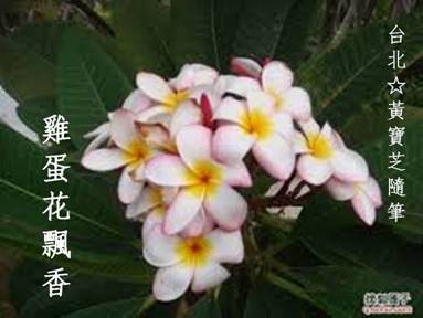 夏天到了,雞蛋花又開了,這時節我一有空就常常走到附近的公園去,只為了去看心愛的雞蛋花,我歡歡喜喜的從地上撿拾起一朵朵剛從樹梢掉下來的花兒,忍不住捧起來對著它深深的呼吸,聞了又聞,我非常喜愛那甜甜的香味兒,更愛它清麗脫俗的花形,心中盡是充滿了喜樂,把花朵兒蒐集起來揣在懷裡,逐一把玩,總是想起