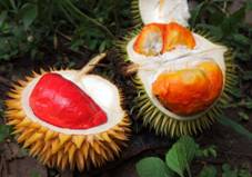 Durian)。其實紅肉榴槤和橘肉榴槤的外型和生長情形,與一般榴槤是有一點差異的,它果實顯然比較細小很多,外殻的尖剌也比較長,而且一般榴槤不可能在同一棵樹上成串生長那麼多的果實。