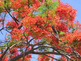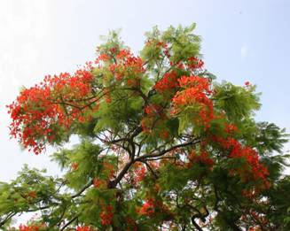 這時節,鮮艷橘紅的鳳凰花很不客氣的每株都開滿了整樹枝頭,就是要搶盡人們的目光,連匆匆的過路客都忍不住為它留下了腳步。鳳凰木被譽為世上色彩最艷麗的花樹,它植株高大,可達20公尺以上,性喜高溫、多日的環境,在酷夏裡,陽光愈是充足的地方,它就生長得愈繁茂,花也開得愈燦爛,紅花配著綠葉,好一副富麗堂皇的樣貎,由於它「葉如飛凰之羽,花若丹鳳之冠」,故取名為鳳凰木。