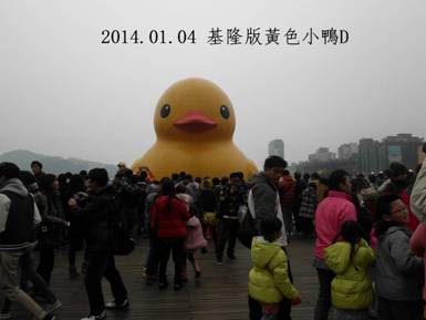 想想台灣人也真夠可憐,平日都被負面新聞搞到悶得發慌,難得有個開心的玩意來,大家就一窩蜂的去湊熱鬧,周邊的小鴨商品大熱賣,今天也是人山人海,我是老早就說好了一定要去看牠的,高雄和桃園版我都沒去看,基隆版小鴨爆開那天我好難過,以為無緣看到牠了,還好牠終於把傷治癒好,又能夠在基隆港露臉了,基隆港登時好像變成了一個大浴缸,小鴨就是孩子們洗澡時玩著泡在水裡的玩具,勾起了人們童年的美好回憶。