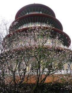 前年大約在四月間,我為了求證在春天裡除了台北陽明山的奧萬大有紅楓可賞之外,上網看到有噗文指北新莊的山上此時也有紅楓,我特地要求先生開車帶我去北新莊尋楓,可是網上的噗文地址有誤,原來紅楓園不在北新莊卻是在鄰近的淡水,我們在尋楓的途中經過北台灣有名的賞櫻景點「無極天元宮」,可惜此時櫻花時節已過,到處只見綠油油的一片,但「天元宮」果然不愧是台北地區著名景點,風景視野極佳,寺後還有雄偉天壇,景緻開闊,直使人有心曠神怡之感。我們離開天元宮後沿路開往淡水,路過一處有路標寫「楓樹試驗所」,我以為找對了地方,由蜿蜒的小路開入竟進入深山中,不見紅楓,卻是到處碧綠如茵,果真是曲徑通幽,沿途啾啾鳥鳴不絕,我們就在這兒第一次與台灣國鳥「藍鵲」巧遇,此次路過「天元宮」雖然賞不到櫻花,但紅楓園在淡水南勢埔已尋到,還意外地看到了珍貴的台灣藍鵲,收穫真是不少。