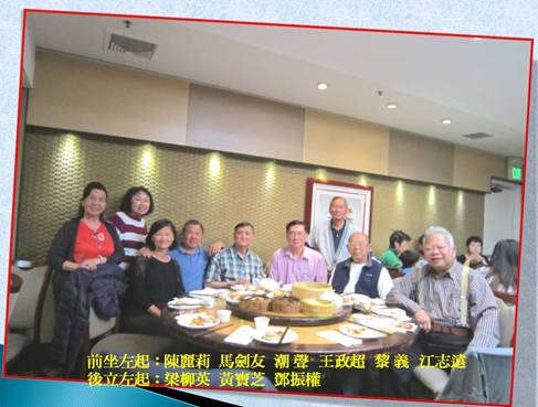 今(2014)年六月初我有要事,突然決定趕赴美國三藩市作短暫的逗留,而下一個行程福州之旅又早已安排好,此次三藩市之行只好來去匆匆,本來意料中處理完要事之後,可能就沒有機會與在美的各位老朋友見面相聚了,想不到梁柳英笛姊果然是位既稱職又能幹的重量級公關人才,她真是有辦法,順著赴聖荷西參加知用校友會之便,竟約到黎義兄開車載她賢伉儷與鄧振權兄到三藩市我二姊家,大家見面真是開心到不得了,原來她還約了潮聲、王政超、馬劍友伉儷、和陳美翎文友,在三藩市最有名的鯉魚門餐廳,等候和我們相聚,我真是感動萬分,驚喜之情難以言喻。