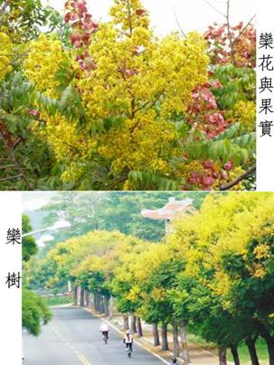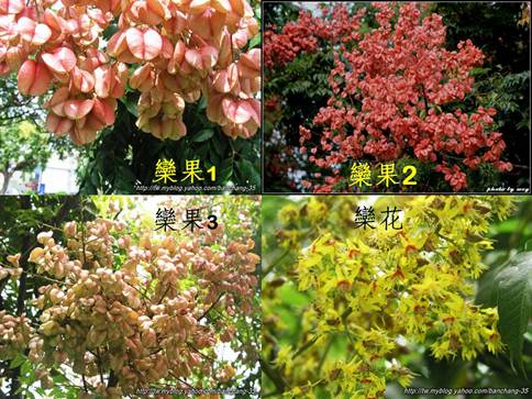 elegans 屬無患子科,因葉形似苦楝故台語又稱她做「苦楝舅」,她還有台灣欒華、金苦楝、苦楝公、拔仔雞油的別名,是台灣原生特有種的植物,屬落葉喬木,樹高約10~25公尺,樹姿甚為優美,夏天時枝葉茂密,極適合作為行道樹、景觀樹,未開花前,台灣欒樹整棵樹呈翠綠色,經常到了光輝的十月天,她即開得滿樹繁花。欒樹的花朵很嬌小,如星狀,起先由鮮艷欲滴的嫰黃點綴著一點紅心,開得非常茂密,形成一串串,彷如皇冠掛在樹梢頭,既美艷又富麗堂皇,花開後她隨即結果,果實有三瓣形如囊狀,有如充氣般漲得十分的飽滿,這時看來就有點像盞盞燈籠,因此她的果實常被誤以為還是像串串美麗的花朵,果實的顏色初時呈淡紅,逐漸成熟後顏色就轉深,蒴果變成一片殷紅,十分艷麗耀眼,再過一陣,由深紅轉為淺褐色,再逐漸加深至深褐色,直至乾枯而掉落,顏色變化共分四色,故又名為四色樹,大家眼看著它顏色的變化,好像在看一場極為精彩的變裝秀。