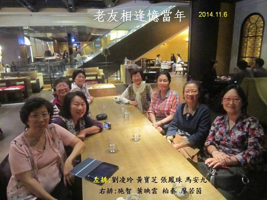 不覺間已闊別了多年的老同事,竟偶然相約到 (張鳳珠、葉映雲、劉凌玲、施智、廖若茵、柏秦、羅文彥太太(馬安九)、和我一共八位共聚在一起,真是十分的難得,大家有說不完的話兒,都是互道別後彼此的牽掛,還有打聽和問候在遠方未能相聚的其他老友。三十多年前,有的甚至還更早,我們從未婚的青春少女時期,到為人妻為人母的那段漫長歲月,不都是每天在一起絮絮叨叨地互相傾訴著彼此家中的瑣碎事兒,或是討論工作上的種種,有時歡笑有時卻是生氣嗎?