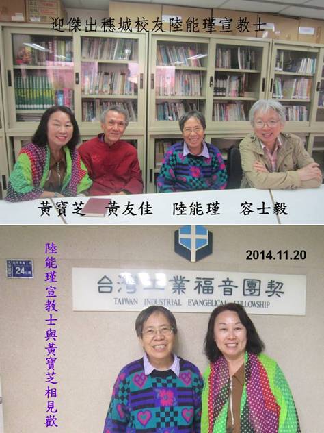 多年來我雖然未能見到能瑾姊姊,但從校友們的口耳相傳中,得悉能瑾姊姊非常能幹而且很有愛心,對她仰慕不已,這次能瑾姊姊剛從杜拜宣道途經台北,過幾天她又要趕往菲律賓去服侍神的工作,趁著在台北短暫的逗留,她特地撥出寶貴時間約見穗校校友,使我能有機會見到她,真是非常開心,11/20日中午,草聖黃友佳約了科學才子容士毅和我,到台北市和平東路的「台灣工業福音團契」和能瑾姊姊見面,草聖還請我們去吃越南餐,容兄請飲水果花茶,我真是叨了光呢。