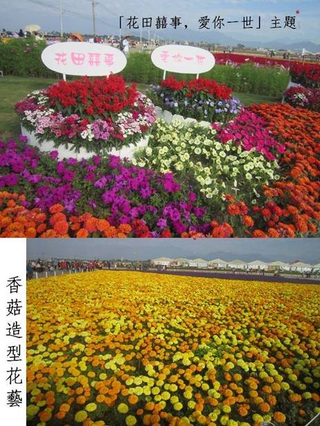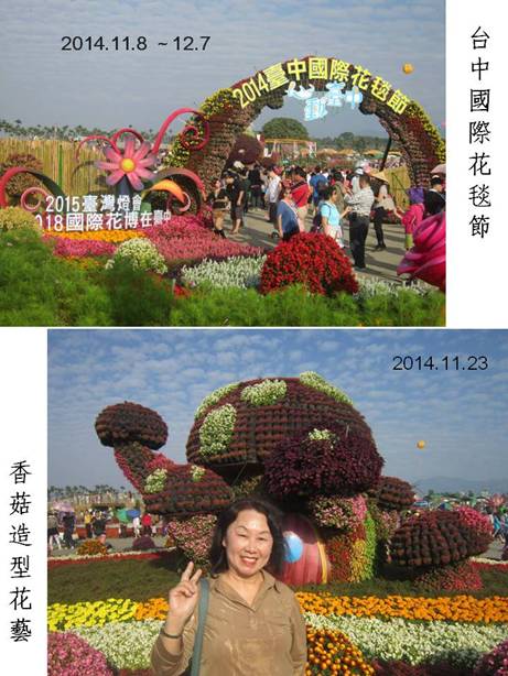 今年2014新社花海節暨台中國際花毯節,自11/8~12/7日在台中近郊新社熱烈登場,開幕才剛兩週湧入的人潮已超過百萬,台中市政府以辦喜事的雀躍心情,將活潑亮麗的花海景觀,配合休閒農業的樂活精神,以及美麗山城豐沛的自然與人文資源,呈現在大家的眼前。