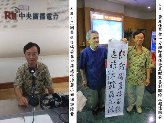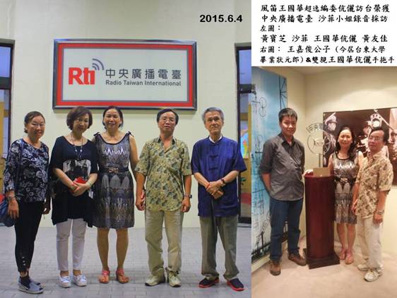 在忠烈祠參觀時接到沙菲小姐來電催促我們立即前去就在附近的央廣,我們不必坐車就安步走過去,這時又接到草聖友佳兄來電,原來他已趕到央廣,正在大門口等我們呢,沙菲小姐非常客氣,不但盡了地主之誼請我們吃晚餐,還特地安排了錄音室,請王編委和夫人及公子一同進去錄音,可惜的是王夫人和公子都很低調,沒講幾句話就匆匆跑了出來,寧可和我們在休息室享受香味十足的可口咖啡,王編委就只好獨挑大樑,在採訪錄音中暢談他與風笛詩網的因緣。