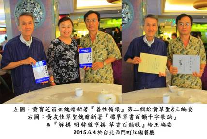 ●香港曾家傑(培傑)老師箋注:王編委超逸勞苦功高,此次攜眷遊台灣,寶芝姐姐和友佳草聖倒履相迎,盡地主之誼,誠盛事也。