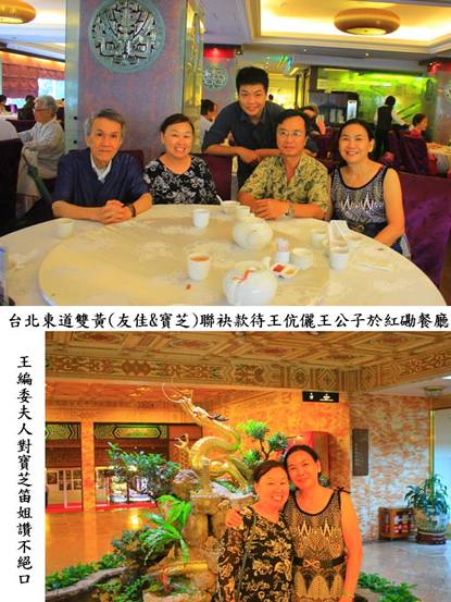 我和草聖黃友佳宗兄早已約好在台北西門町的紅磡茶餐廳與王編委一家三口飲茶午餐,我特地提早了大約一個鐘頭到紅磡餐廳恭候他們,草聖很準時午間11點就到了,他才剛坐下,與我們素未謀面的王編委立即現身前來打招呼,因為他曾在風笛刊出的照片中認得友佳宗兄,見他來到我的桌前,就知道正在忙著接手機為7月去汶萊開會事煩心的那個人就是我,他首先熱切地伸出友誼之手和我們緊緊相握,這時我才知負責風笛詩網古體詩部份的王編委超逸兄,原來是如此的年輕有為。