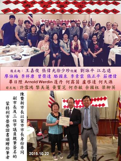 陳贊新市長是來自香港的傑出華人,最近榮耀當選蒙市市長,他勤奮熱誠獲得蒙市政商各界的熱烈支持,當晚他非常難得的答允出席翌日十月廿四中午,一共有廿七位包括羅省文友及穗城校友聯合在蒙市HILTON飯店為我舉辦的歡迎宴會及為甫訪大陸帶譽歸來的蓬丹女作家洗塵。我更是意外地得到陳贊新市長頒贈以蒙市市長身份率同副市長及三位市議員親筆簽名的蒙特利市榮譽證書,真是喜出望外,感到無限的光榮。