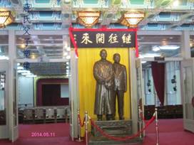 走進鑲著古銅雀紋金花邊的紅色古雅大門,立即被大廳內富麗堂皇的陳設驚豔,無論樑柱、牆壁和天花板上的圖案設計皆十分精緻美麗,且色彩鮮豔,到處都有「福」「夀」字樣及圖騰,配著大紅色的地毯,充滿著喜氣洋洋的氣氛,還有最吸睛的是匠心獨具、式樣繁多且極為別緻的宮燈,使參觀來賓讚賞不已,其螺鈿傢俱更是大方典雅,深獲文化藝術界人士高度評價,國父孫中山先生的塑像端坐在大廳的中央,國父的背後有一個鑲著金鉑非常耀目的「歡迎光臨」屏風,內堂是原來國民大會會場的「中華文化堂」,面積約600坪,可容納約1,800人, 有1,100 個座位呈拋物線狀整齊排開,文化堂內無樑柱,完全沒有遮擋的角落,空間十分寬闊也無迴音的情形,挑高約三層樓的高度,更是呈現出恢宏的氣勢,這真是個使人走入時光隧道的地方,歷史的鏡頭彷彿一幕幕躍然於眼前,讓人不禁墜入陳年的回憶中。