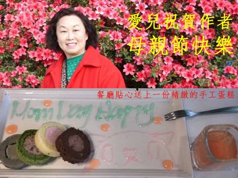 用餐過後,兒子才告訴我這是一家全素餐廳,每一道菜都是純素的食材,如果兒子不說我真的完全察覺不出所有的食物都是來自各種蔬果,廚師的廚技精湛加上食材的巧妙運用,使人大開眼界,從開胃前菜、湯品、主餐到甜點及飲料原來都是純素的食材,其色、香、味都有恰到好處的調度與搭配,實在比葷菜有過之而無不及,真使我稱異不已。最使我感恩的是餐廳非常的細心,在問卷中得悉此次餐會是我兒為慶祝母親節而來,在我們餐後特地送上一份小禮物(一個精美的水杯和兩本記事冊),以及一小盤精緻的手工蛋糕,用糖醬書寫著祝賀我母親節快樂,其貼心可見。