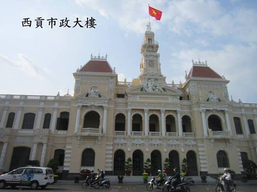 此次回鄉,我們從濱城大街市往黎聖宗街走去,就看到這幢建於1908年非常華麗的洛可可式風格的市政府辦公大廈,它的迷人風采果然依然存在,遠遠望去就像一座古色古香的西洋宮殿,華麗而典雅,整幢建築物線條簡潔又明朗,外牆是淺淺的黃色,配著紅瓦,看來十分的悅目,它樓高只有二層,其廊柱、門框、屋簷等部位有西方神話人物和法國英雄人物為主要題材的精緻雕塑,巧奪天工的細緻裝飾使這幢大廈顯得非常有氣派。市政廳門前有一個廣場花園,是遊人拍照的最佳地點,也是結婚的新人喜歡到來拍攝婚紗照之處。花園中央有一尊胡志明主席抱著一個小女孩的塑像,使我想起剛解放時胡志明市街頭巷尾最流行的一首越共歌曲「ai