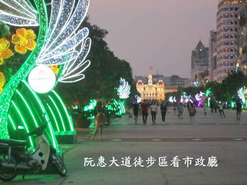 此次,我們在接近傍晚時分到來,不多久正是華燈初上,市政府大樓亮起燦爛奪目的燈飾,更增加了它的美感,它的正門對著有花街之稱的阮惠大道,這條街道有燈光璀璨的徒步區,真是美不勝收,這兒的確不愧是胡志明市最令人難以忘懷的經典夜景。