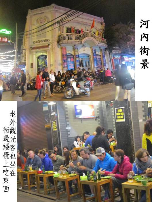 初抵河內,它給我的印象非常好,走在街頭發現人潮並不輸西貢,但好像是有點秩序的,馬路上的車子也沒有西貢的恐怖,人們十分友善,共同點是都喜歡圍坐在街邊的小矮櫈上吃東西,連老外觀光客也都入鄉隨俗,整排的坐在還劍湖附近一帶徒步區的攤檔前吃東西,我和先生還不大習慣,總是笑笑就走開了,拍街景時也怕惹來人家的反感,好在他們都習以為常了。我們幾天來都把握住自由時間出門到處去遊逛,也有圍觀在街邊的文娛表演場,去感受那種特殊的氛圍,真是收穫甚豐,心情是相當愉快的。