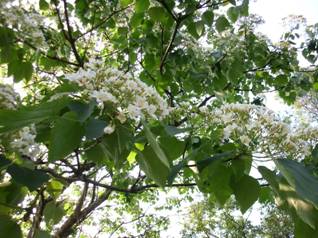 據說台灣油桐樹大致有兩個品種,木油桐(千年桐,果皮皺摺),和桐油樹(三年桐,果皮光滑),開的花都是雪白色,花蕊處稍帶紅色或金黃色,十分清麗脫俗,一般是五個花瓣,但我發現也有六瓣,甚至七瓣的,花朵如十元銅板甚至是五十元銅板的大小,整團整團的開滿枝椏,簇擁在樹梢頭,形成叢叢的花海,使空氣中飄盪著淡淡的花香,偶爾微風吹過,白淨嬌嫩的花朵紛紛隨風飄散,有如一陣花雨,也如下著五月飛雪,瞬間樹下如鋪上一片白色的地毯,但樹梢頭仍是繁花密佈,此情此景,山野間盡是充滿了詩情和畫意。