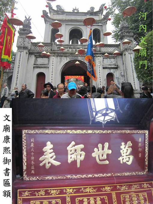 Miếu Hà-Nội我們甚有親切感,因為這兒處處都有著濃濃的中華文化氣息,文廟的本身是一座傳統的中國式孔廟建築,坐落於還劍湖的西側,佔地26000多平方米,坐北朝南的座向,據說它完全仿照中國曲阜孔廟的建築格局來興建,大部分現有建築是十七世紀李朝建造,整個建築群由五組院落組成,門外立有下馬碑,前院有一個大水池,大堂內的正中央高懸著一塊寫有“萬世師表”的漢字匾額,匾上有註明是“康熙御書”,緊靠大門是一副長達38字的漢字對聯,兩邊精美的雕花石柱上又有漢字對聯,大門正中上方有“文廟門”三個漢字,醒目而莊重。