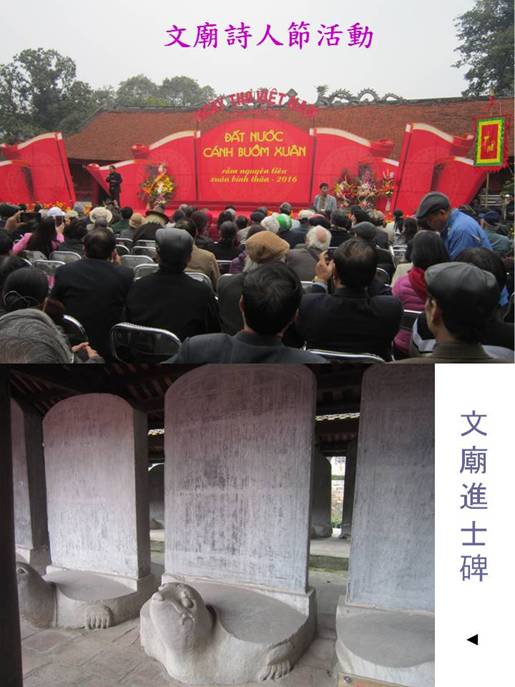 我們到訪之日剛巧是越南的詩人節,廣場上搭了一個舞台,許多詩人輪番上台吟詩,贏得不少掌聲,內殿廳堂裡亦有彈唱表演,當日文廟真是熱鬧非凡,到來參與盛會的民眾各個年齡層都有,可見河內的文風相當鼎盛和普及。我們此次河內之行,雖沒有足夠的時間去觀賞聞名世界的《水上木偶戲》,幸好在文廟內殿聽到非常精彩的彈唱表演和吟詩的朗誦會,也算是不錯的收穫。