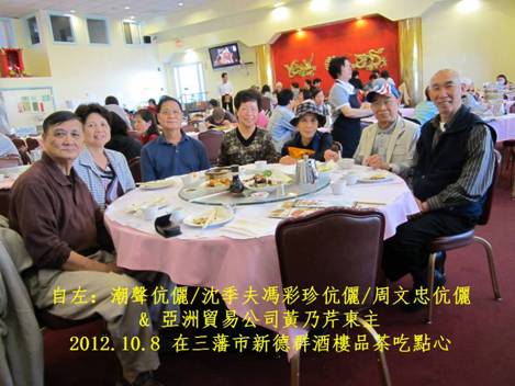 自左:潮聲伉儷/沈季夫馮彩珍伉儷/周文忠伉儷 & 亞洲貿易公司黃乃芹東主 2012.10.8在三藩市新德群酒樓品茶吃點心