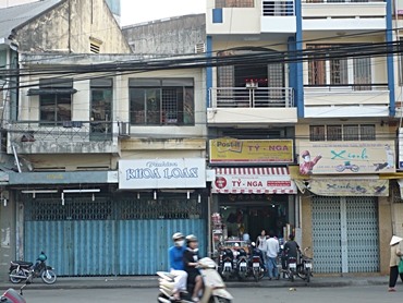 四海通在賽瓊林大酒家對面,德華布莊隣近,余少年時曾隨先外祖母,先母在四海通購蚊帳,見女店東以事頭婆稱之。 圖中Ty-Nga,即原屬平房之四海通蚊帳店,今已改建成四層樓房。左鄰Khoa Loan,為原來雙鋪面之有記棧。右鄰為原來四鋪面之宴芳園茶家,改建成四單位分租。
