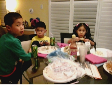 聖辰餘慶火雞餐 一眾孩童笑眼看 筷子刀叉齊出動 為嚐鮮味不旁觀
