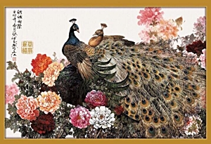 鳳冠招紫氣 翠羽綉前程 孔雀迎新歲 屏開向錦榮