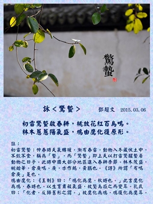 初雷驚蟄:仲春時天氣轉暖,漸有春雷,動物入冬藏伏土中,不飲不食,稱為「蟄」,而「驚蟄」即上天以打雷驚醒蟄居動物之日子。此時中國大部分地區進入春耕季節。林木茂盛,桃始華,倉庚鳴。庚,亦作鶊,黃鸝也。《詩》所謂「有鳴倉庚」是也。