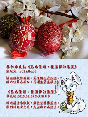 乙未清明、復活節的清晨 2015. 4. 5 清明復活雪飄飄 難阻兒孫掃墓潮 來到待甦安息處 天家再㑹萬愁消