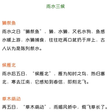 三候是指雨水節氣之獺祭魚,候雁北,和草木萌動。見附圖網擷。