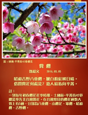 一到每年初春櫻花花季時期,士林區-平菁街42巷總是率先北台灣開花。在台灣常見的櫻花種類大致上有5種,分別為八重櫻、山櫻花、寒櫻、昭和櫻、吉野櫻。