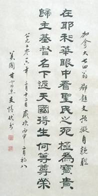 此輓聯原係當年應曾民治弟兄之請,為其丈人張成安老先生之安息禮拜而寫,以聖經一節作上聯,自擬下聯對之。今轉作自輓聯備用,見詩篇116篇15節。