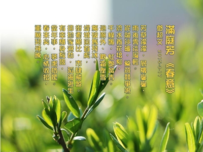芳草濛濛,層樓疊疊,雨後雲淡風輕。泥融沙暖, 鶯燕競爭鳴。流水養花培柳,千綠媚,紅艷黃青。迴廊外、欺霜壓雪,梅破舊殘冰。