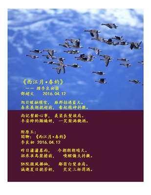 旭日暖融積雪,雁群掠過藍天。春來展翅競超前,奮起精神抖擻。
