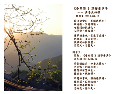雲淡日當前。晨曦我挹先。照通衢、里巷相連。七彩繽紛欽造化,心寧靜、悟玄禪。