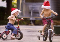 這是美聯社2006年12月19日發的 一張新聞照片,報道的是,2006年12月 18日,美國北卡羅來納州格林伯絡的3歲 男孩克勒(左)和他的五歲的哥哥萊姆, 趁著溫暖的天氣在戶外玩耍。離聖誕還有 一周,他們的媽媽就給他們購買了聖誕老人 的帽子,他們已經迫不及待地戴上了。 天真無邪的孩子啊,你們的笑容多麼燦爛,多麼溫暖。可是溫暖的聖誕背後是什麼?是雪山和冰川的融化,是海平面的升高,是無可遁逃的滅頂之災!