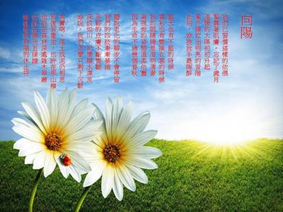 我們已習慣這樣的依偎 緊靠著肌膚,忘記了歲月 溫暖的太陽初初升起 紫外線拉出明亮的音階 此刻,妳挽我手最陶醉 藍天也有不藍的時候 雲彩也有變換衣裳的時候 我的眼睛總是澄明清澈 凝視妳的姿態溫柔依舊 因為生命不過幾個春秋 聽說老化的腳步不會停留 我們的四肢漸漸萎縮 年輕的皮膚不斷變皺 深紋如川,記憶順水漂流 妳說,我們怎麼只剩下沉默 其實啊,落土成泥仍相思 別後若重生,也許在那山嶺 也許在森林深處雜木草叢 也許在陽光五線譜 妳就是我吟唱的休止符