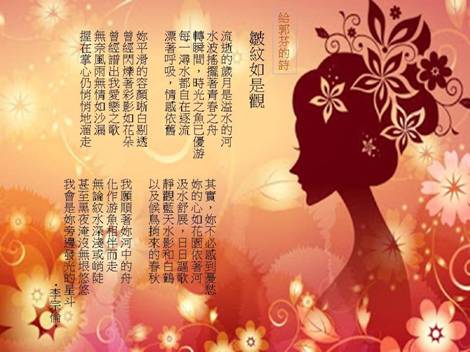 其實,妳不必感到憂愁 妳的心如花園依著河 汲水舒展,日日謳歌 靜觀藍天水影和白鶴 以及候鳥捎來的春秋