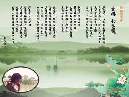 記憶又學著山嵐 飄進我搜尋的期盼 又藏入我落筆霑染的墨醰 每一筆劃都勾勒著妳 無語如荷花,淡淡然