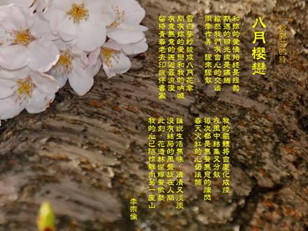 和妳的愛情始終是短暫 期遇的目光總是蹣姍 縱然我們有會心的交談 雨季作弄,驟來驟散 雪白夢紗披成八月花傘 間有妳的愛戀和我的吶喊 有意無意的邂逅最浪漫 留待青春老去印痕伴書案 我的軀體將會塵化成煙 在風中結集又分散 每次都是無聲無息的爍閃 春天火紅的心仍跳顫 誰說生活無味,清清又淡淡 沒有結局的風盤旋在人間 此刻,花道林徑蟬聲依然 我的心已隨妳飄向另一座山