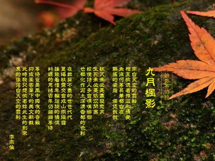 來自天空的雲彩 相互依偎著殘溫和情愛 血液何等昇華都自在 飄搖的姿態,優悠哉哉 秋天未必是蕭瑟悲哀 生死未必是低沉閉塞 縱使詩人多會喟嘆徘徊 也都化作泥土深濃香郁的色彩 在數算不盡的世世代代 夏陽秋露交會成山雨陰霾 誰能看懂年輪迴旋的情懷 糾纏的思緒百年仍癡癡等待 等待豈是風中獨有的音籟 抑或墨客筆下的美文新裁 此時我只想依著妳此生的到來 真的像落自天空的雲彩
