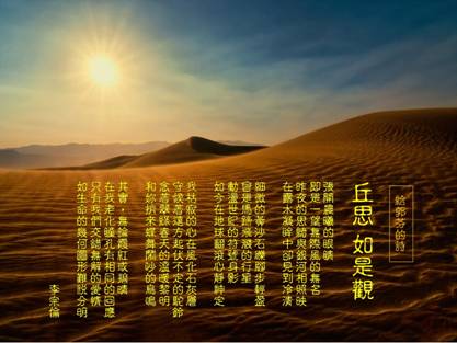 丘思 如是觀 張開晨曦的眼睛 即是一望無際風的無名 昨夜的思緒與銀河相照映 在露水凝眸中卻見到冷清 細微的黃沙石礫腳步輕盈 曾是馬蹄飛濺的行星 動盪世紀的符號身影 如今在地球翻滾心靜神定 我枯寂的心在風化石灰層 守候著遠方起伏不定的駝鈴 念著翠綠春天的溫暖黎明 和妳捎來蝶舞鬧吵的鳥鳴 其實,無論霞紅或碧晴 在我老化瞳孔有相同的回應 只有我們交錯無解的愛情 如生命的幾何圖形難說分明