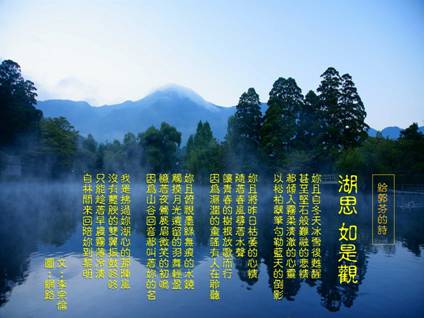 妳且自冬天冰雪後甦醒 甚至堅石般難融的悲情 都傾入霧柔清澈的心靈 以松柏翠筆勾勒藍天的倒影 妳且將昨日枯萎的心情 隨著春風尋著水聲 讓青春的樹根放歌而行 因為濕潤的童謠有人在聆聽 妳且俯視墨綠無痕的水鏡 觸摸月光遺留的羽舞輕盈 憶著夜鶯展眉微笑的初鳴 因為山谷回音都叫著妳的名 我是拂過妳湖心的那陣風 沒有豐腴的雙翼振鼓咚咚 只能趁著早晨霧薄冷清 自林間來回陪妳到黎明