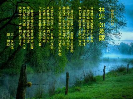 林思 如是觀 森林孳長青翠需多少春秋 山澗流瀉綠意需多少水波 千仞岡堅毅立在傾斜的地球 我們共度的歲月卻悄悄溜走 山林炎陽的爭吵已翻騰至最高點 開始冷卻則是脈絡削瘦的葉尖 聽說遠方有雨季濕潤的召喚 風也在黃葉落地前拂來短暫的秋暖 望著分割的不朽,我無心深究 是新芽抽綠抑或澗水東流 只是尋索崖邊水滴的源頭 從垂直聲音聽見妳的愛依舊 山林根處釋放的聲音漸漸回響 葉泥交融的春意隨風四盪 我們枝椏交纏,伴影依著水岸 挽著今生,不管朝夕是何年